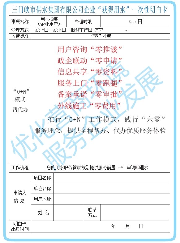 三門峽市供水集團有限公司企業(yè)“獲得用水”一次性明白卡